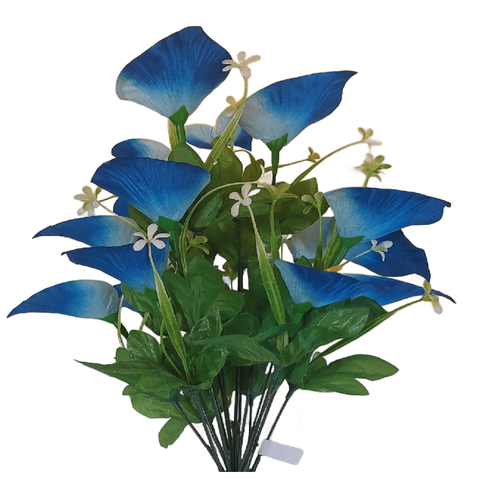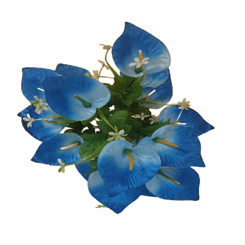 Bukiet sztucznych niebieskich kalii. Jest idealnym rozwiązaniem dla osób, które cenią sobie trwałość i estetykę. Bukiet Składa się z 18 realistycznie odwzorowanych kwiatów. Całość bukietu  wykonana z tworzywa sztucznego, co sprawia, że nie trzeba się martwić o świeżość. Bukiet Świetnie prezentuje się jako samodzielna dekoracja salonu, jadalni, sypialni lub biura, a także jako element większej kompozycji. Idealnie nada się jako prezentem dla bliskiej osoby na walentynki, śluby oraz inne specjalne okazje.
