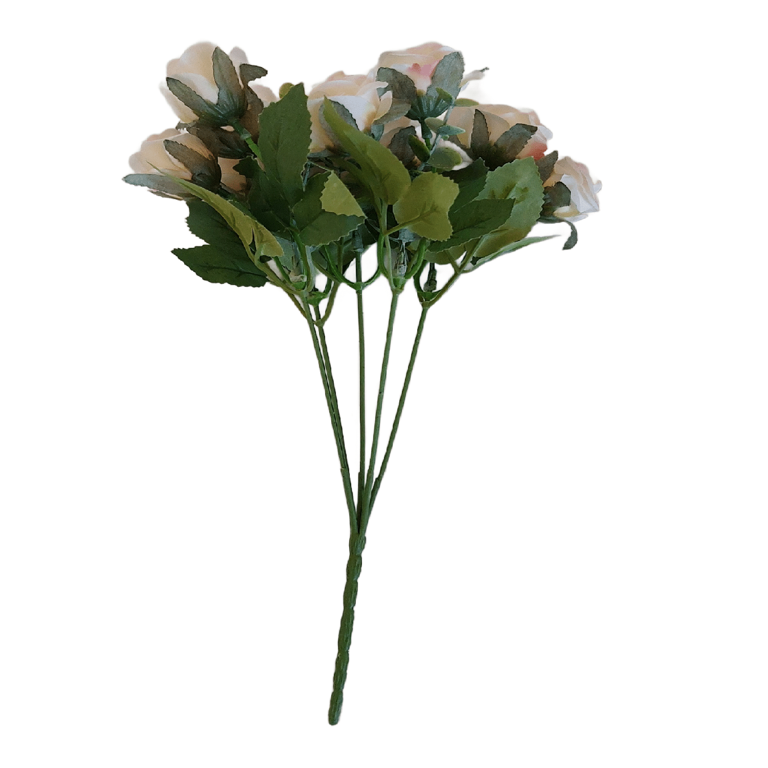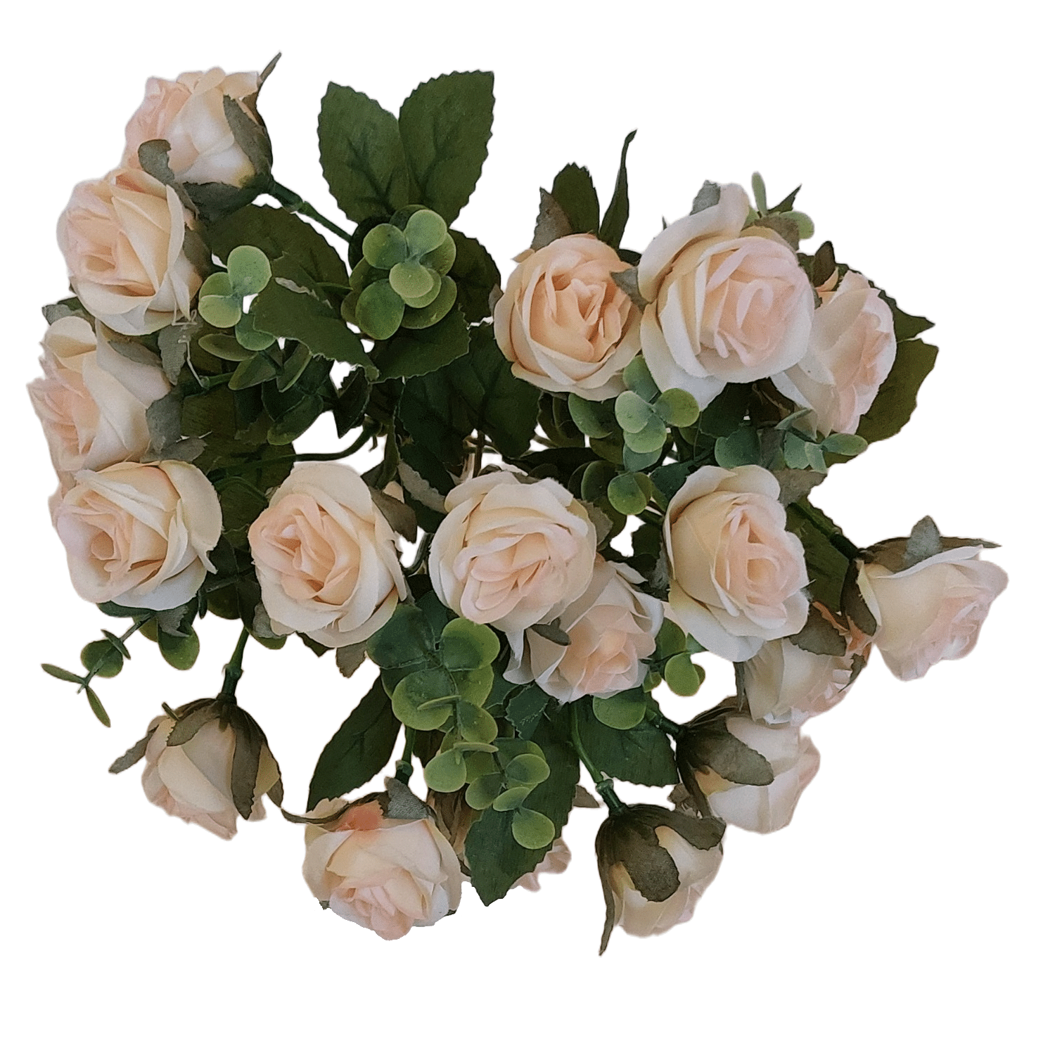 Ten kompaktowy bukiet sztucznych szampańskich róż sprawdzi się jako subtelna dekoracja wazonu, ozdoba stołu czy dodatek do większych kompozycji florystycznych. Doskonale komponuje się z innymi kwiatami i zielenią, tworząc estetyczne i stylowe zestawienia.