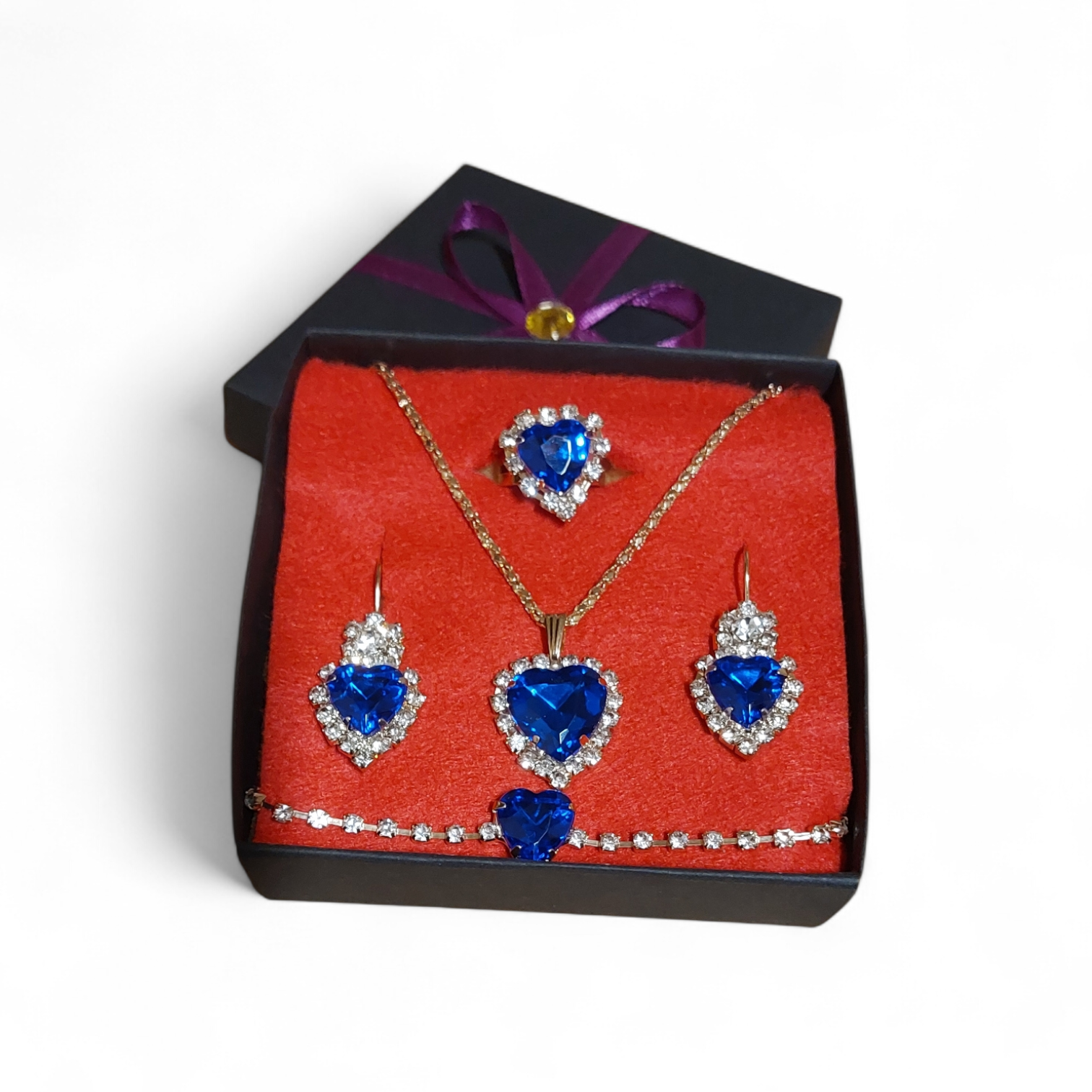 Biżuteria utrzymana jest w efektownej kolorystyce. Głęboki niebieski kolor kamieni pięknie kontrastuje z jasną oprawą. Całość prezentuje się elegancko i stylowo. Kamienie w kształcie serca dodają zestawowi wyjątkowego charakteru.